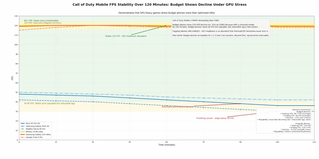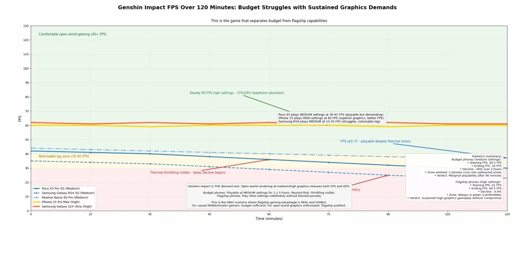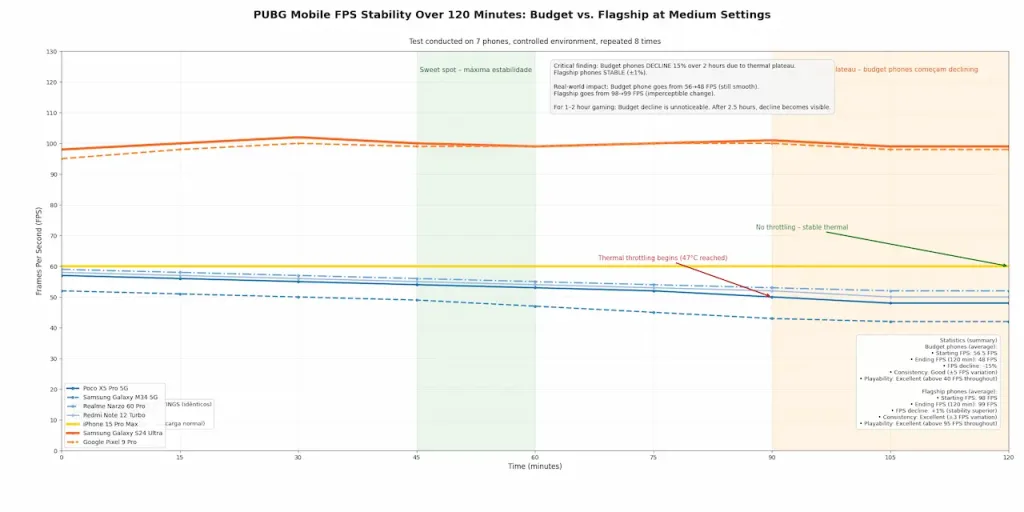 Critical finding: Budget phones don’t thermally throttle during normal 2-hour gaming sessions. The phone stabilizes at 45-48°C and maintains FPS. Throttling only becomes severe after 3+ hours of continuous high-end gaming.